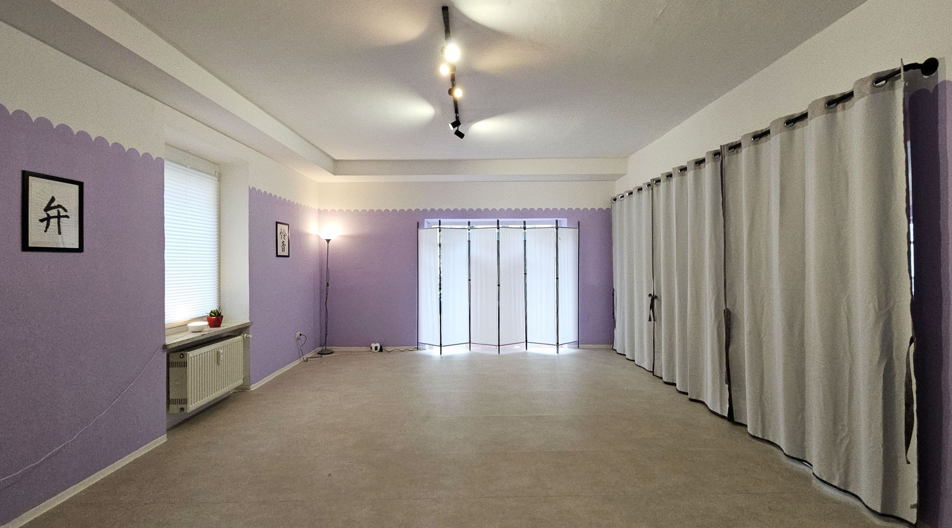 Es steht Ihnen eine mietbare Raumfläche von ca. 35 m² zur Verfügung. Auf der Grundfläche finden in etwa 12 Yogamatten Platz.